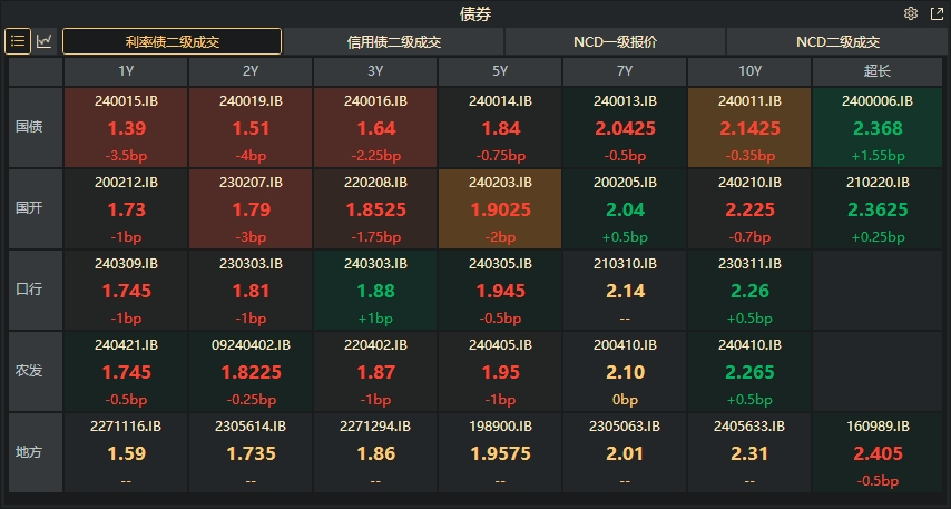 银行间主要利率债收益率涨跌不一,截至下午16:30,10年期国债活跃券240011收益率下行0.35bp报2.1425%,30年期国债活跃券2400006收益率上行1.55bp报2.368%,10年期国开活跃券240210收益率下行0.7bp报2.225%。