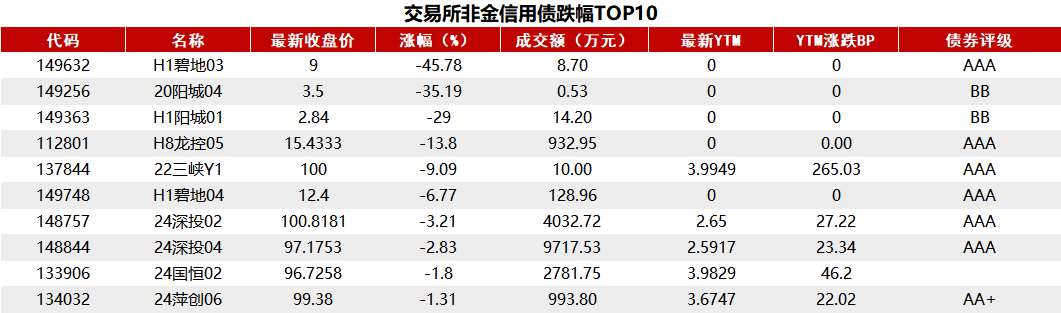 据Choice 数据统计显示,今日交易所市场非金信用债跌幅排行前五的分别是:H1碧地03、20阳城04、H1阳城01、H8龙控05、22三峡Y1。具体如下: