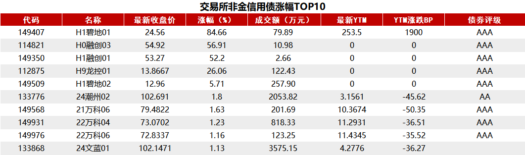 据Choice 数据统计显示,今日交易所市场非金信用债涨幅排行前五的分别是:H1碧地01、H0融创03、H1融创01、H9龙控01、H1碧地02。具体如下: