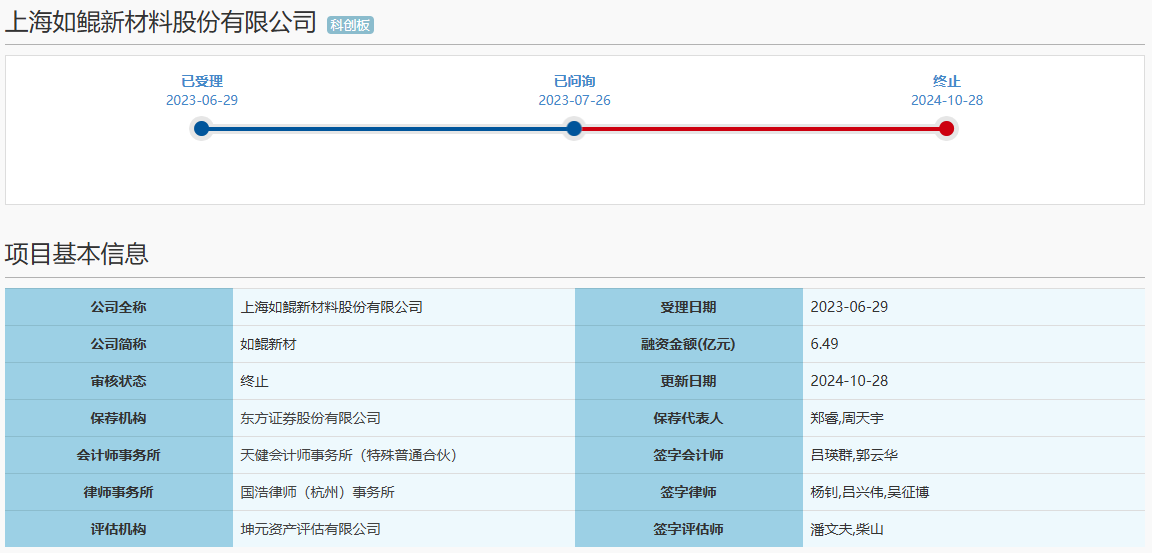 因上海如鲲新材料股份有限公司及其保荐人东方证券股份有限公司撤回发行上市申请,上交所终止其科创板发行上市审核。