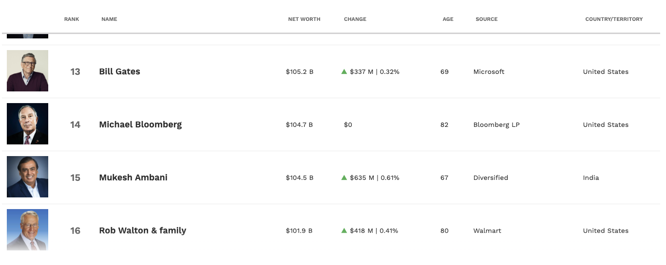 根据福布斯富豪榜,布隆伯格的身价与比尔·盖茨差不多,都在1050亿美元左右。
