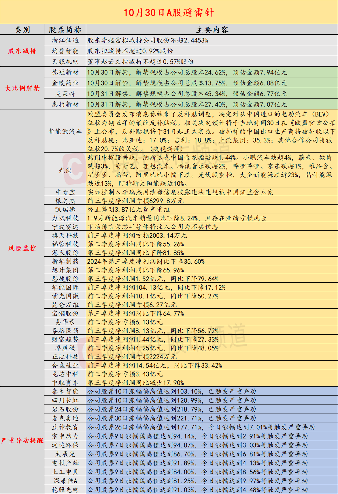 导读:财联社10月30日投资避雷针,近日,A股及海外市场潜在风险事件如下。国内经济信息方面包括:1)主板A股公司市值退市标准将从3亿元提高至5亿元;2)欧盟决定对中国电动汽车征收为期五年的最终反补贴税;公司方面重点关注包括:1)中青宝实际控制人李瑞杰因涉嫌信息披露违法违规被中国证监会立案;2)银之杰前三季度净利润亏损6299.8万元;海外市场重点关注包括:1)热门中概股普跌,光伏股重挫;2)香港9月楼价创逾8年新低,连跌5个月。