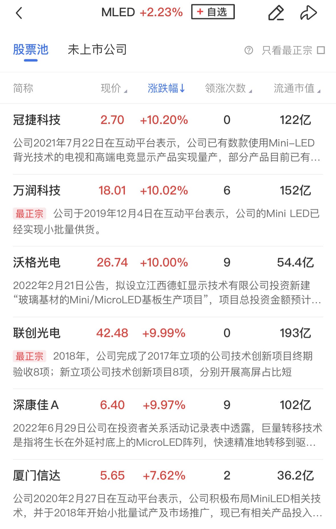 Mini LED概念股震荡走强,TCL科技、万润科技、沃格光电、冠捷科技等涨停,深天马A、京东方A、联得装备、厦门信达等个股涨超5%。