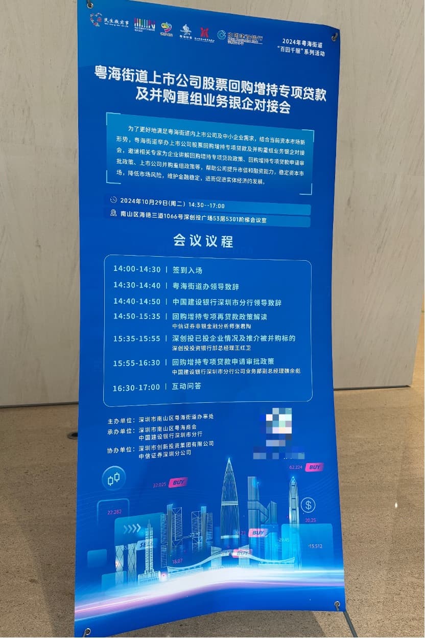 10月29日,由粤海街道主办的上市公司股票回购增持专项贷款及并购重组业务银企对接会在深圳南山召开。参加各方包括银行、头部券商非银分析师、创投机构主要负责人及多家上市企业及非上市企业。会议内容来看,主要为邀请相关专家为企业讲解回购增持专项贷款政策、回购增持专项贷款申请审批政策、上市公司并购重组政策等,帮助公司提升市值和融资能力,稳定资本市场,降低市场风险,维护金融稳定,进而促进实体经济的发展。