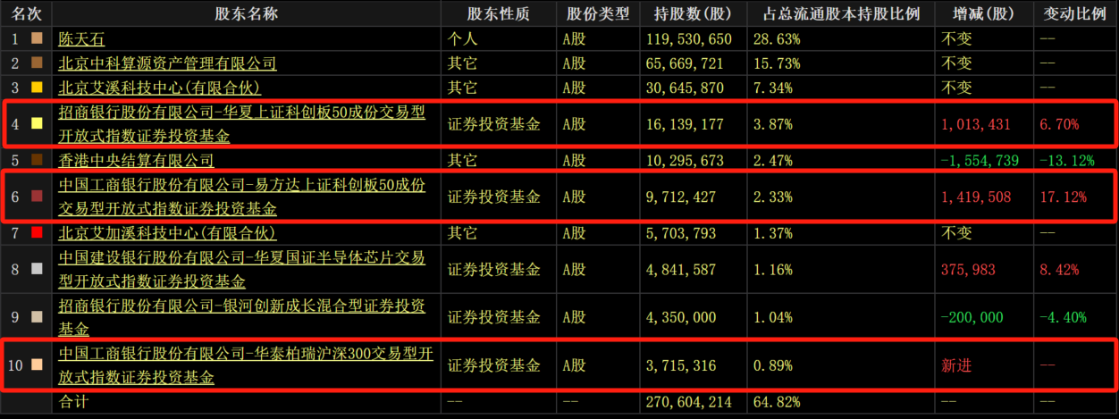 股东变动方面,前十大流通股东中,华夏上证科创板50成份ETF、易方达上证科创板50成份ETF、华泰柏瑞沪深300ETF三支指数基金在第三季度均有不同程度的加仓,合计增持超600万股。其中,易方达上证科创板50成份ETF增持141.95万股,变动比例达17.12%。