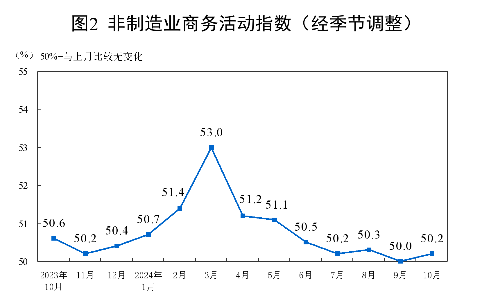10月份,非制造业商务活动指数为50.2%,比上月上升0.2个百分点,非制造业景气水平小幅回升。