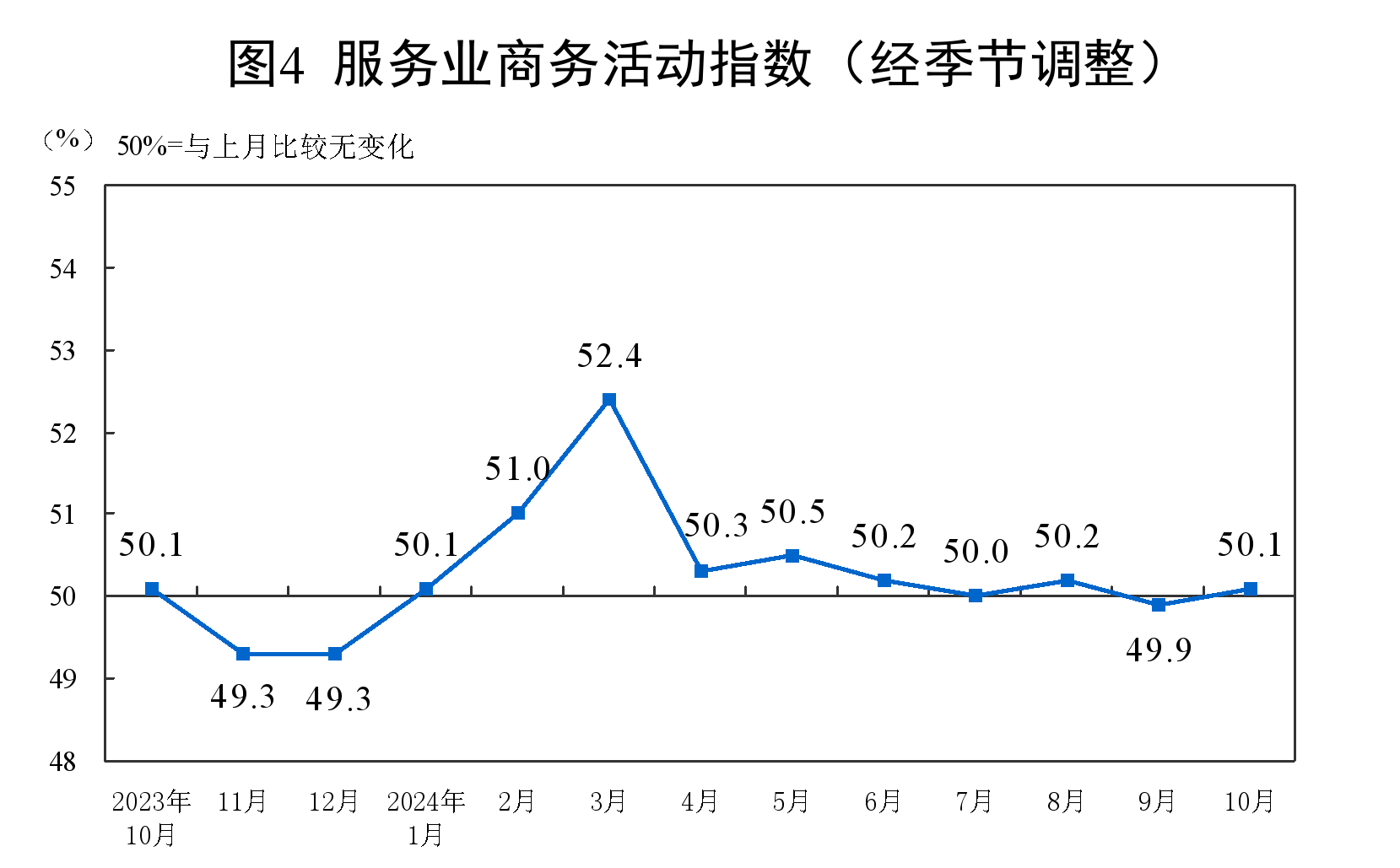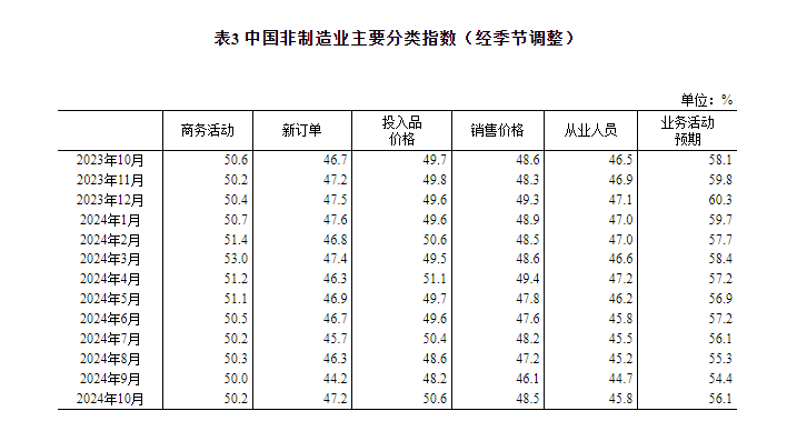 10月份,随着一揽子增量政策加力推出以及已出台的存量政策效应逐步显现,我国经济景气水平继续回升向好。制造业采购经理指数、非制造业商务活动指数和综合PMI产出指数分别为50.1%、50.2%和50.8%,比上月上升0.3、0.2和0.4个百分点,三大指数均位于临界点以上。