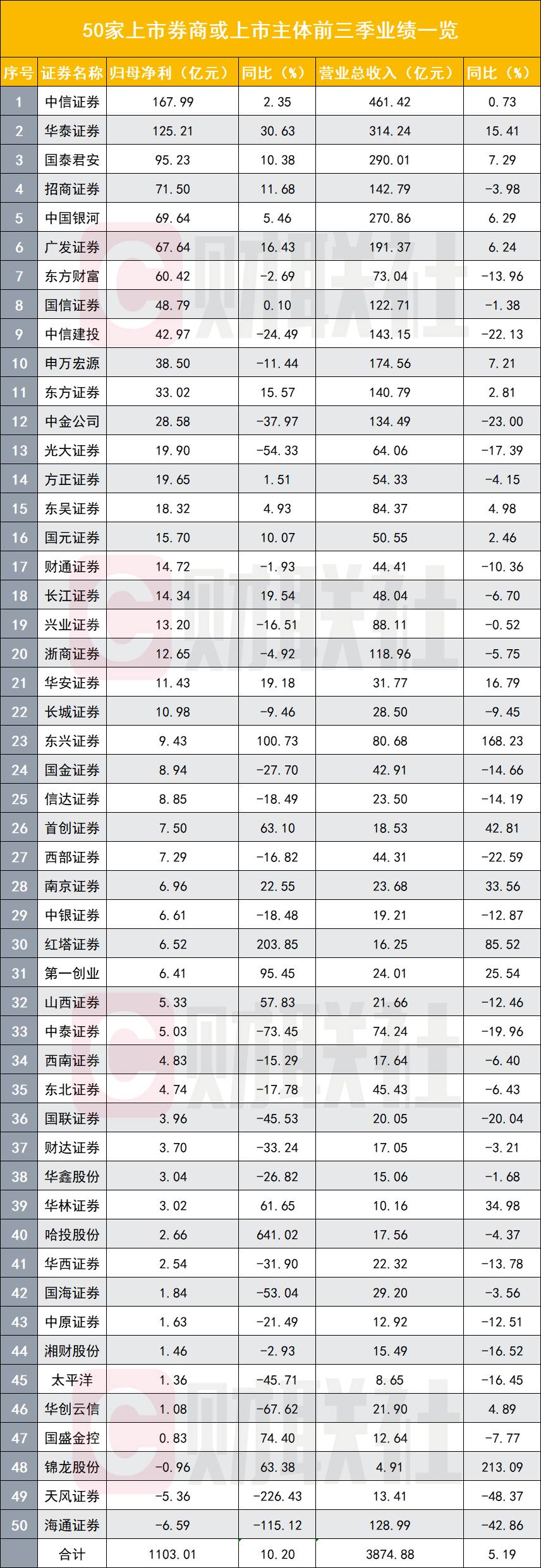 50家上市券商或上市主体,前三季归母净利算数平均同比增10.2%,其中,23家前三季归母净利增速为正,其他27家增速为负。