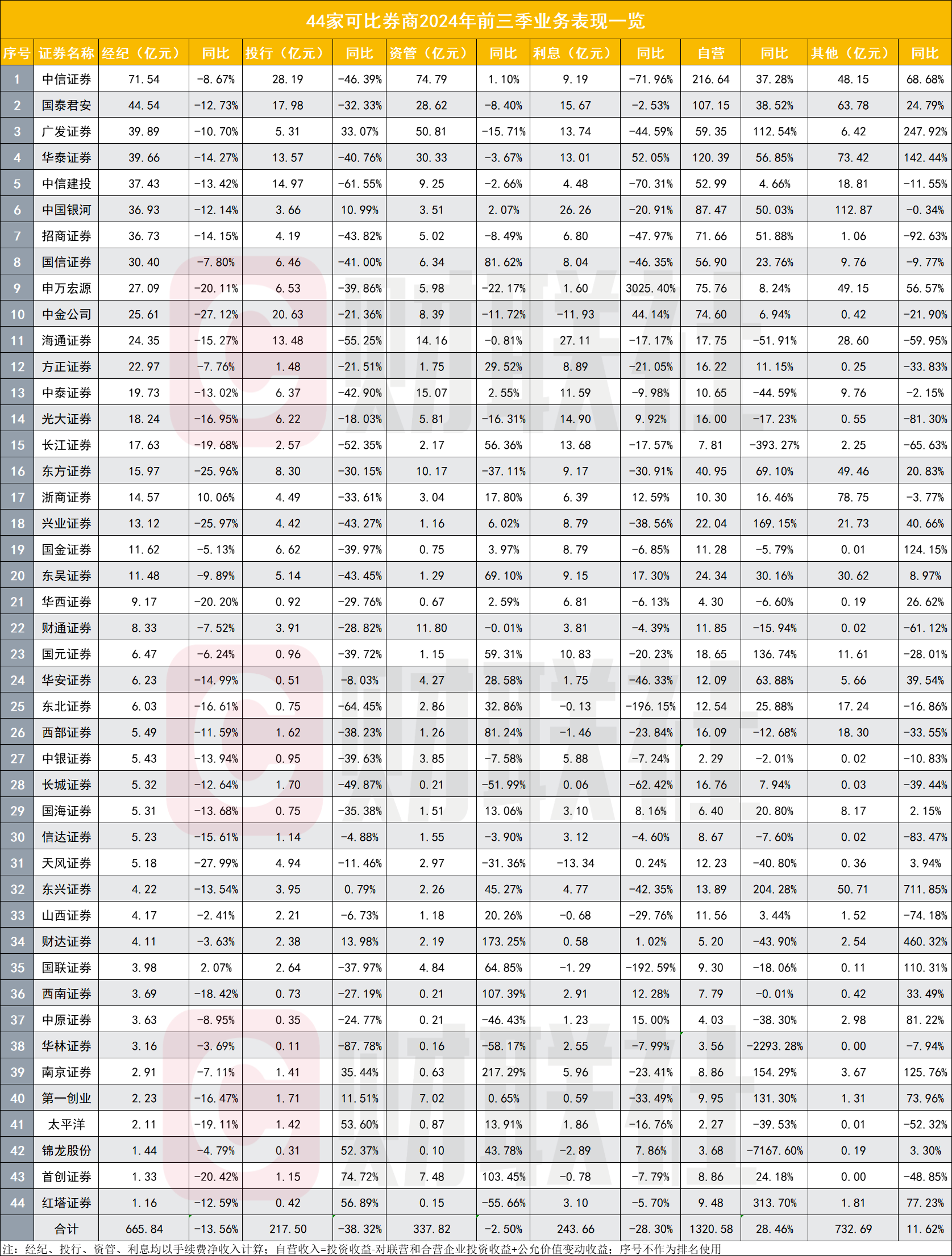 此外,就各业务表现来看,45家数据可比上市券商或上市主体,经纪业务净收入合计为665.84亿元,同比下滑13.56%;投行业务净收入为217.50亿元,同比下滑38.32%;资管业务净收入为337.82亿元,同比下滑2.50%,利息净收入为243.66亿元,同比下滑28.30%;自营业务收入为1320.58亿元,同比增28.46%;其他业务收入为732.69亿元,同比增11.62%。