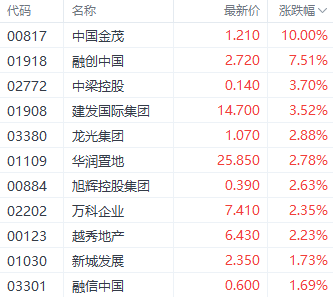房地产股中,中国金茂(00817.HK)、融创中国(01918.HK)、中梁控股(02772.HK)分别上涨10%、7.51%、3.70%。