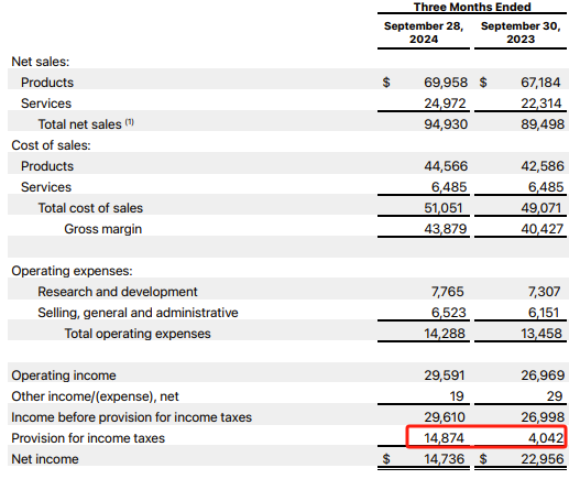 财联社11月1日讯(编辑 赵昊)周四(10月31日)美股收盘后,苹果发布了2024财年第四财季(截至2024年9月28日)的财务业绩。