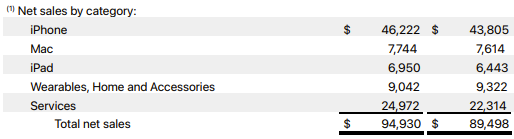 可穿戴设备、家居和配件产品的收入同比下降3%至90.42亿美元;服务营收增长12%至249.72亿美元,再创历史新高,是公司收入增长的主要动力,但仍不及252.8亿美元的市场预期。