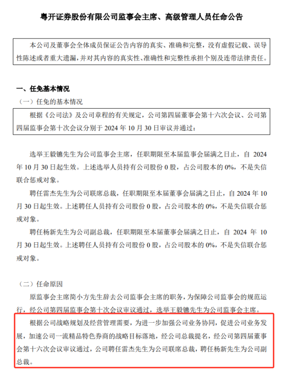 财联社11月1日讯(记者 林坚)10月31日,粤开证券发布公告称,公司聘任雷杰为联席总裁,聘任杨新为公司副总裁。这是年内公司第二次高层发生重要调整。就在9月初,公司刚迎来市场化招聘的新总裁崔洪军。