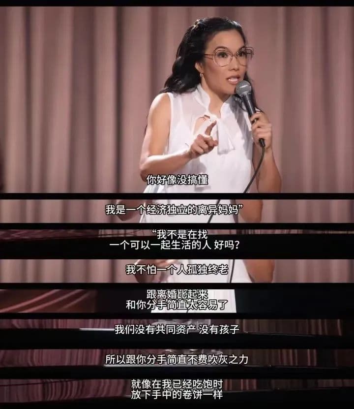 黄阿丽的人生被讲过很多次了,几个重要的标签是——曾经她的演出只需要10美元的门票都没人看,现在成了全美最值钱的亚裔脱口秀明星。还有她的“哈佛吴彦祖”老公,是位日菲混血的亚裔。阿丽一见面就打定主意套牢有钱帅气的老公,为了绑住他天天做早餐,从而过上自己期待的躺平生活,再也不想上班。结果丈夫要求她签署婚前协议,最后还发现丈夫负债7万美元。这些后来都成了她脱口秀里的素材。