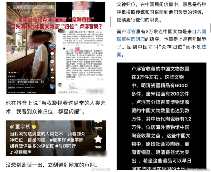 从在收藏着3万余件中国文物的卢浮宫里感叹“众神归位”,到在奥运会期间呼吁不要唯金牌论,被网友嘲讽“哪都有你”,“竞技体育不要金牌那还参加什么比赛”。