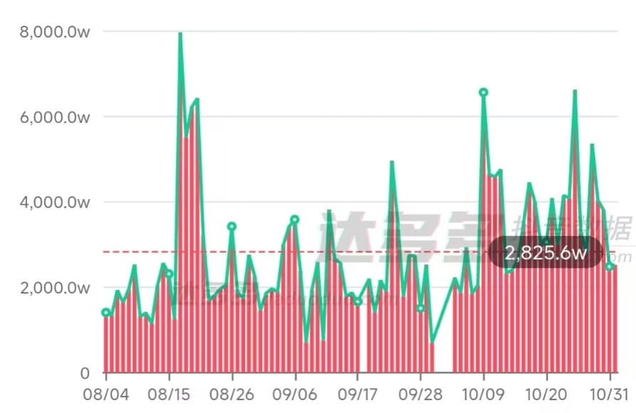 据达多多数据,三个月内,与辉同行共开播158场次,平均开播时长将近10个小时,场均观看人次为703万,日均销售额为2800万,按照这个数据简单测算,仅是三个月内,与辉同行直播销售额就已经超过25亿。