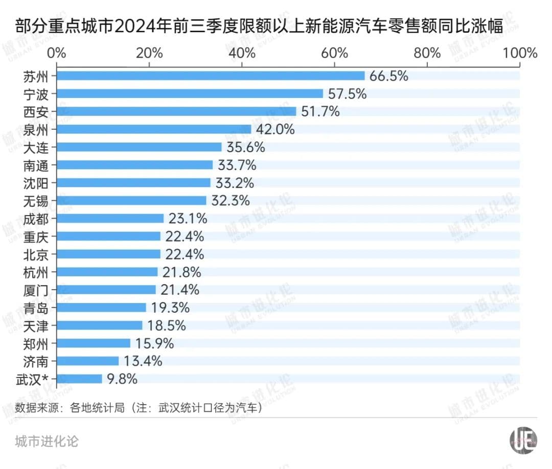 前三季度,苏州新能源汽车销售额同比增长66.5%、家用电器和音像器材类零售额同比增长70.4%,两项增速均排在最前列。这也使得苏州成为GDP前十城市中,社零增速最亮眼的城市之一。