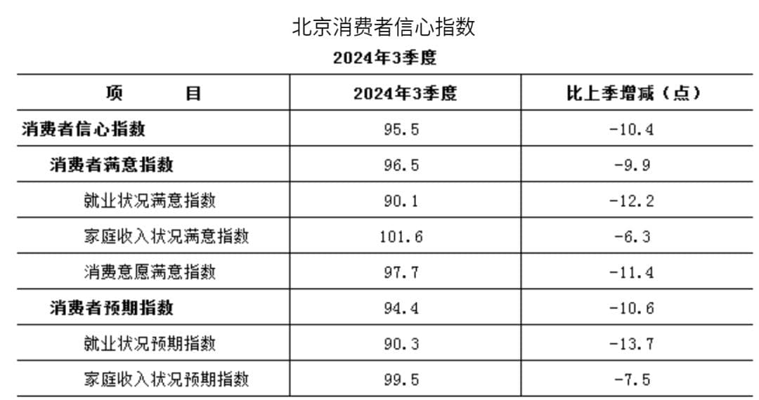 目前而言,公众消费信心仍然不足。北京统计局数据显示,2024年三季度,北京居民的消费者信心指数为95.5,环比下降10.4%,处于弱信心区。其中,就业状况预期指数90.3,环比下降13.7%。