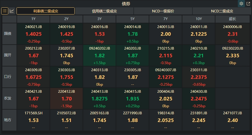银行间主要利率债收益率涨跌不一,截至下午16:30,10年期国债活跃券240011收益率持平报2.1225%,30年期国债活跃券2400006收益率下行0.6bp报2.31%,10年期国开活跃券240210收益率上行0.3bp报2.21%。