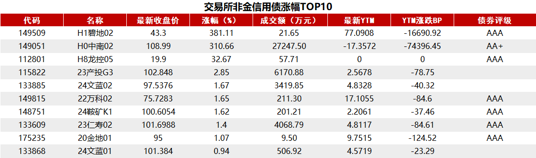 据Choice 数据统计显示,今日交易所市场非金信用债涨幅排行前五的分别是:H1碧地02、H0中南02、H8龙控05、23产投G3、24文蓝02。具体如下: