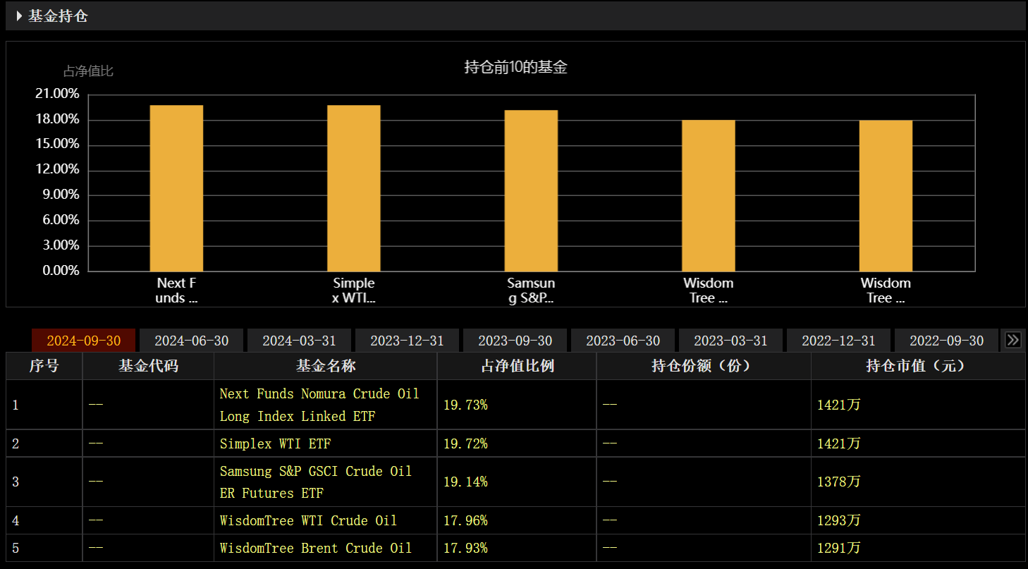 根据choice数据显示,该基金的主要持仓是与原油挂钩的ETF、原油基金等,通过FOF配置来达到追踪原油价格的目的。
