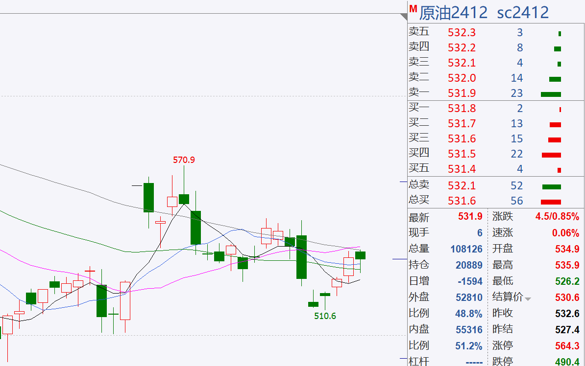 截至今日收盘,SC原油期货收盘涨0.85%,报531.9点。油价自上周低点以来进入阶段性回升,仍处于震荡区间。