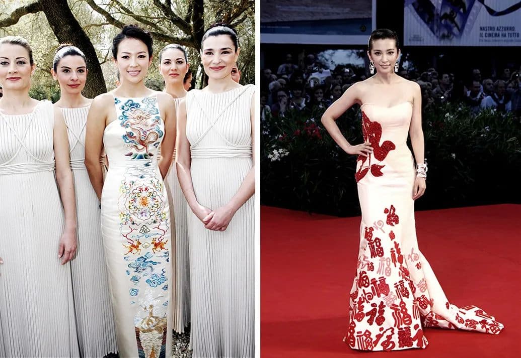 左:章子怡参加雅典圣火采集仪式右:李冰冰穿着“百福礼服”走威尼斯电影节红毯