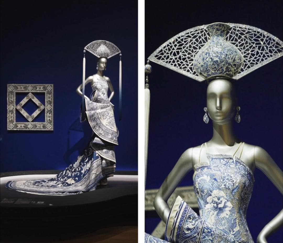 “黄皇后”和“青花瓷”都是《一千零二夜》系列的,“青花瓷”代表的是中国皇后,搭配的鞋子是跟最高的,“欲戴皇冠,必承其重”的意思。今天它在M+以最完美的比例出现,想让大家看到它的美。