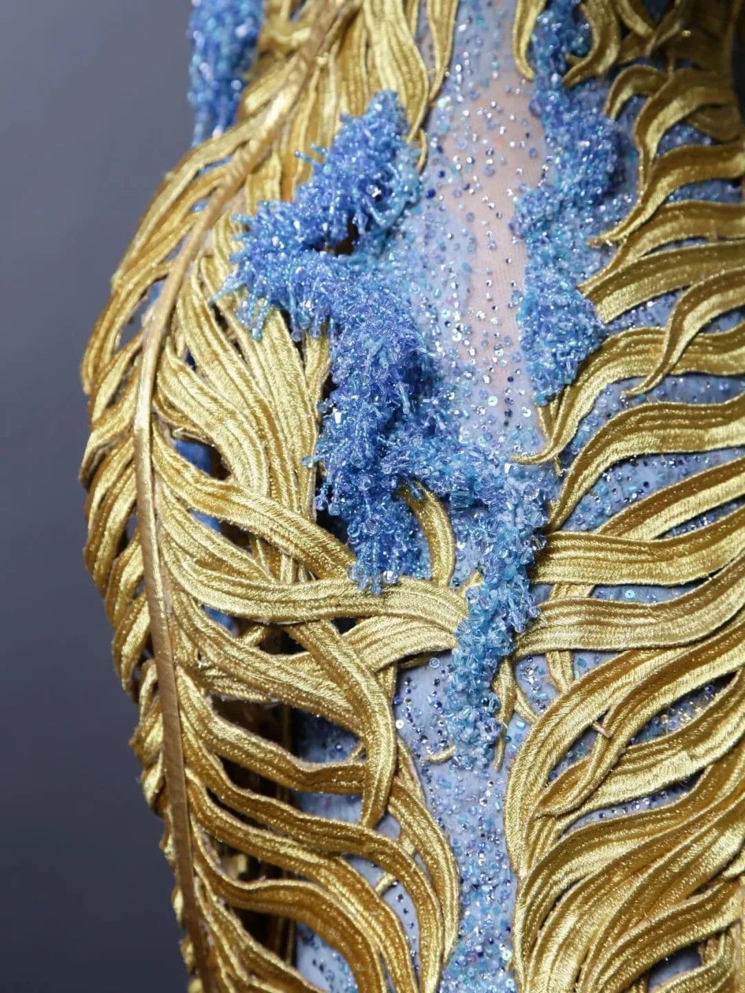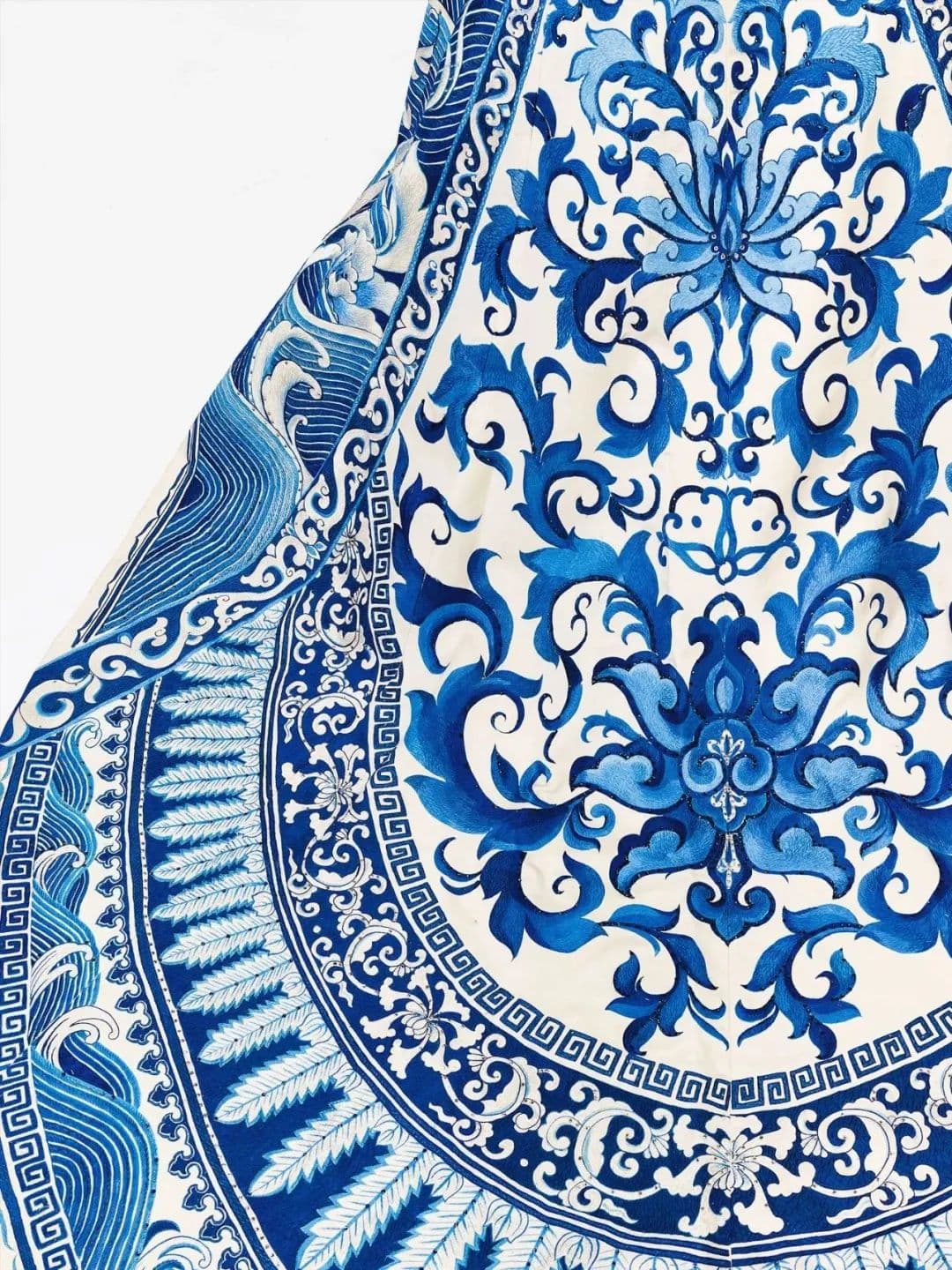“青花瓷”礼服上的祥云纹、水纹和莲花纹等图案,均以手绘面料结合手工刺绣展现