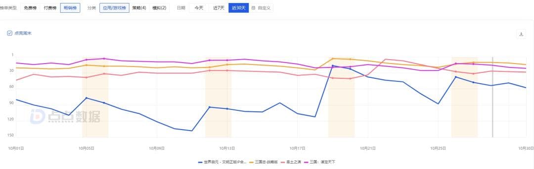 《三国:谋定天下》的创新搅动了SLG市场,倒逼多家头部选手进行同步优化和价格战。然而,随着首批服务器即将走完三个赛季,市场震荡期结束,市场开始重新归于平稳。根据点点数据,10月期间,《三国:谋定天下》、《率土之滨》、《三国志:战略版》在IOS畅销榜排名均在30位左右徘徊。而《世界启元》则稳定在畅销榜前100位,并在月末逐渐回升至这一区间的上游,成为SLG赛道上“率土like”游戏的新四强之一。