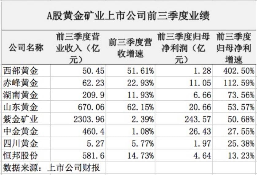 截至10月31日三季报披露截止日,受益于金价上涨,以黄金矿业开采为主营业务的上市公司前三季度业绩普遍表现十分亮眼,赚得“盆满钵满”。