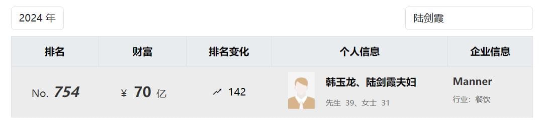 而随着Manner的规模不断扩大,创始人韩玉龙、陆剑霞夫妇的身价也达到了如今的70亿元。