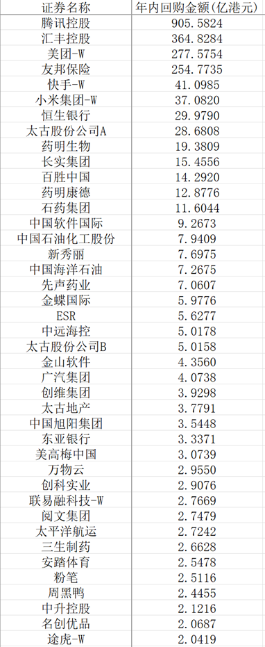 港股市场中,腾讯控股(00700.HK)、汇丰控股(00005.HK)、美团-W(03690.HK)、友邦保险(01299.HK)、快手-W(01024.HK)在年内回购金额分别为905.58亿港元、364.83亿港元、277.57亿港元、41.09亿港元、41.10亿港元。