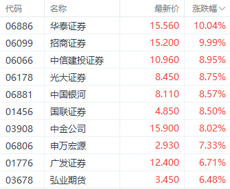 券商股中,华泰证券(06886.HK)、招商证券(06099.HK)、中信建投证券(06066.HK)分别上涨10.04%、9.99%、8.95%。