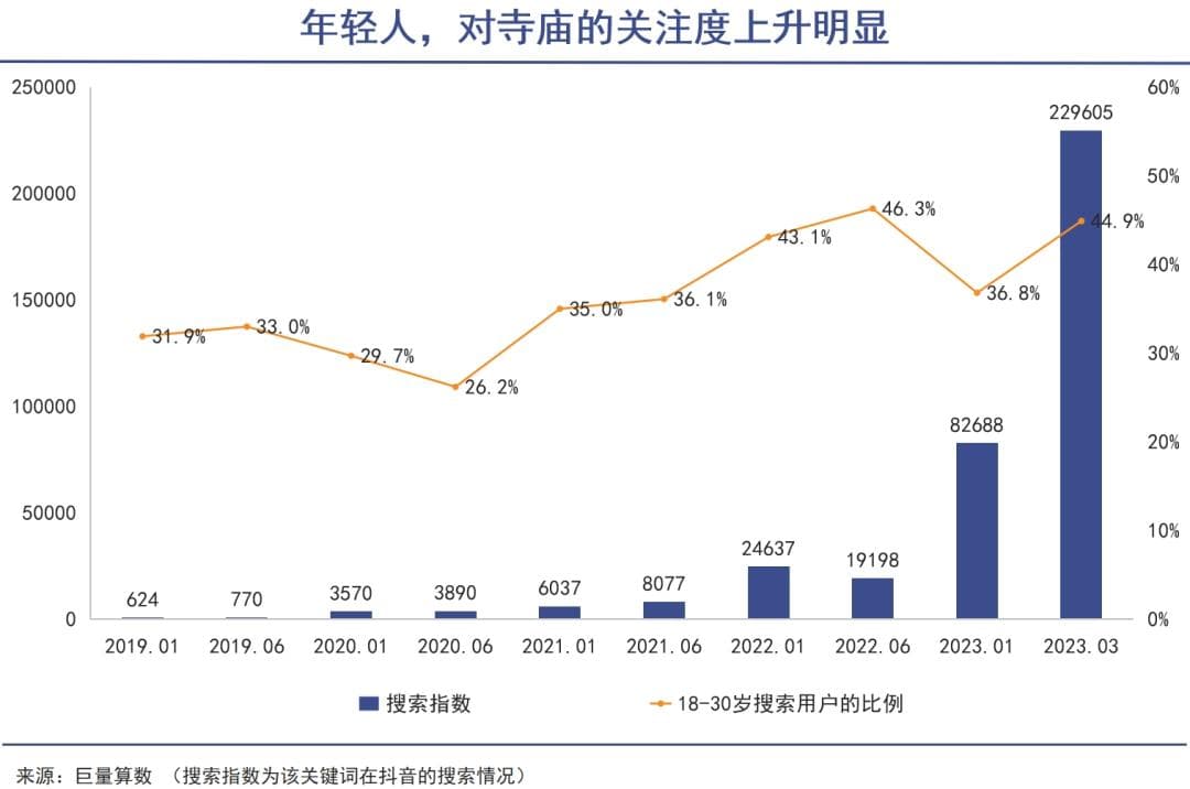 除了提供适合“养老”的生活环境,还有一些产业致力于为年轻人提供适合“养老“的心灵环境。最典型的比如寺庙经济,近几年在国内火的一塌糊涂,2023年搜索量直线增长了 368 倍,如今年轻人热衷于寺庙打卡, 90后、00后占据了寺庙旅游的半壁江山。