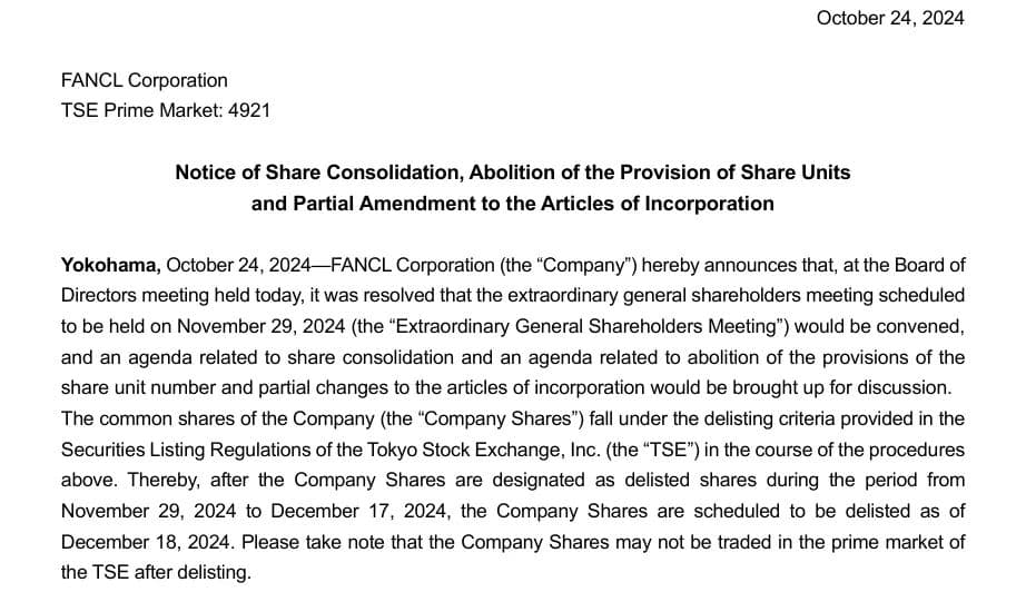 值得一提的是,日前,芳珂集团官网发布了《股份合并、取消提供股份单位及修订部分公司章程的通知》(以下简称:《通知》),其中明确:芳珂集团定位为麒麟健康科学业务的核心子公司,股票计划于2024年12月18日退市。