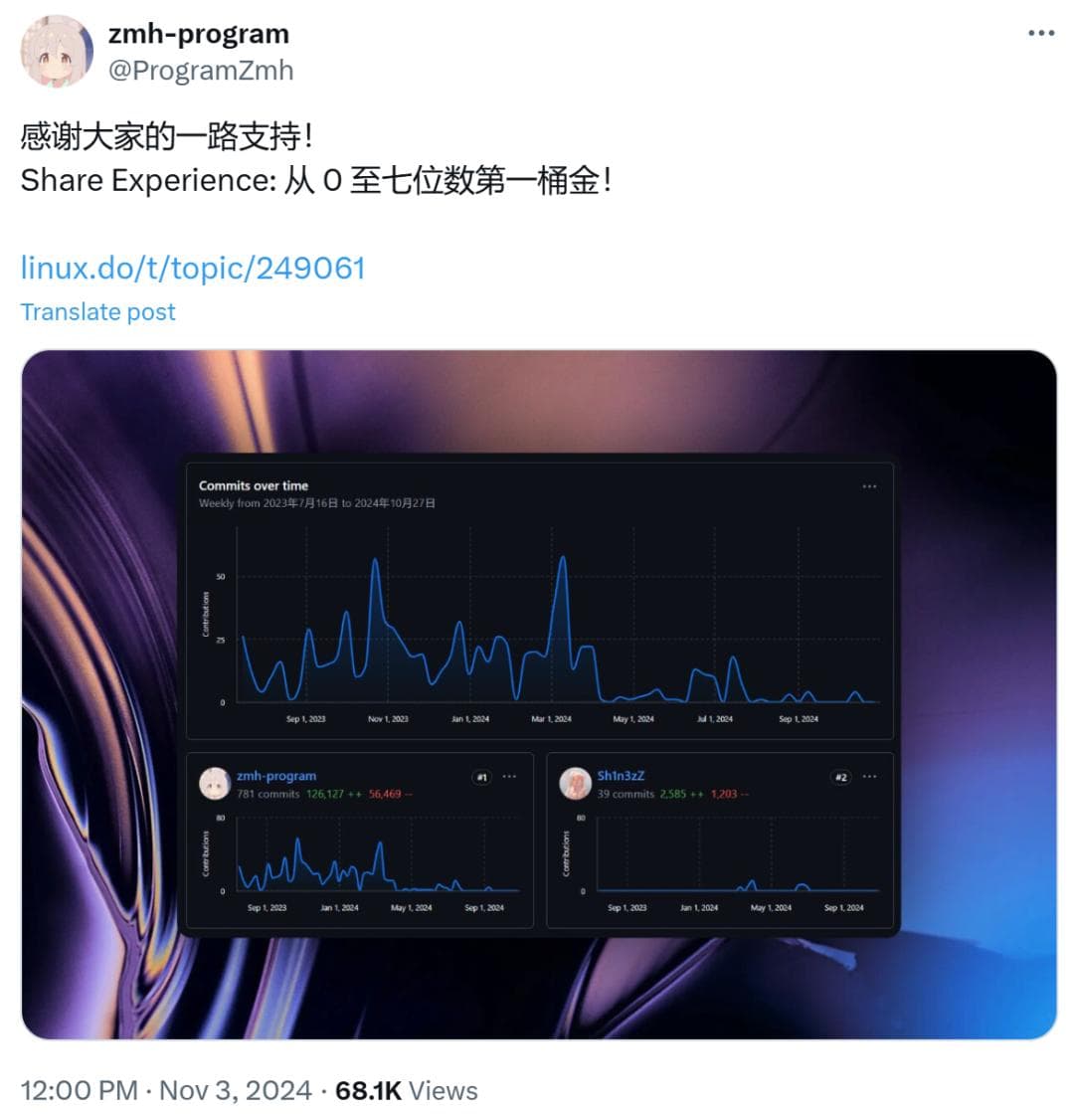 凭借这些优势,Chat Nio 收获了许多用户的青睐和支持,在 GitHub 上已斩获 3.4k+ Stars,月活用户高达 10w+,月盈利也达到了 5w+ 元——而据 Zmh 最新透露,目前 Chat Nio 项目已被成功收购,之后将改名为 CoAI.Dev,而他本人也就此实现了从 0 到七位数的第一桶金。