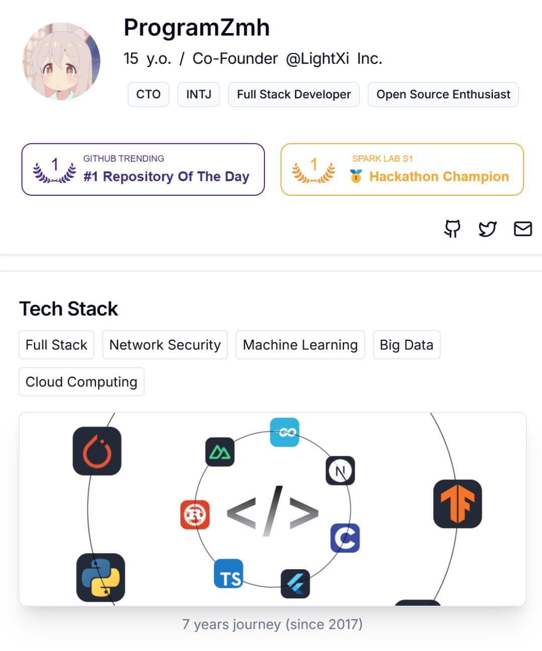 2009 年出生、拥有 7 年编程经验、担任公司 CTO、开源项目被数百万元收购——你没看错,这些 Tag 都属于同一个人:一位年仅 15 岁、刚上高一的山东少年。