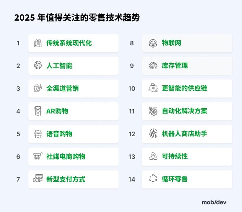 近日,知名软件服务商MobiDev发布了对2025年零售技术的趋势预测报告,并展示了如何利用这些技术推动产品创新,并助力实现零售企业战略目标。本文精选了排名前几位的技术趋势分析,与大家分享。