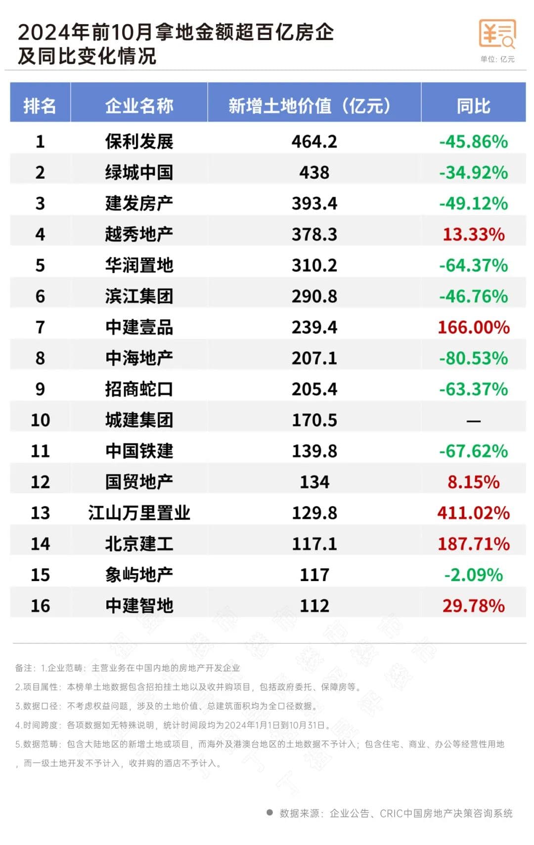 2024年1-10月,百强房企销售操盘金额同比下降32.7%的情况下,房企新增土储降幅延续。