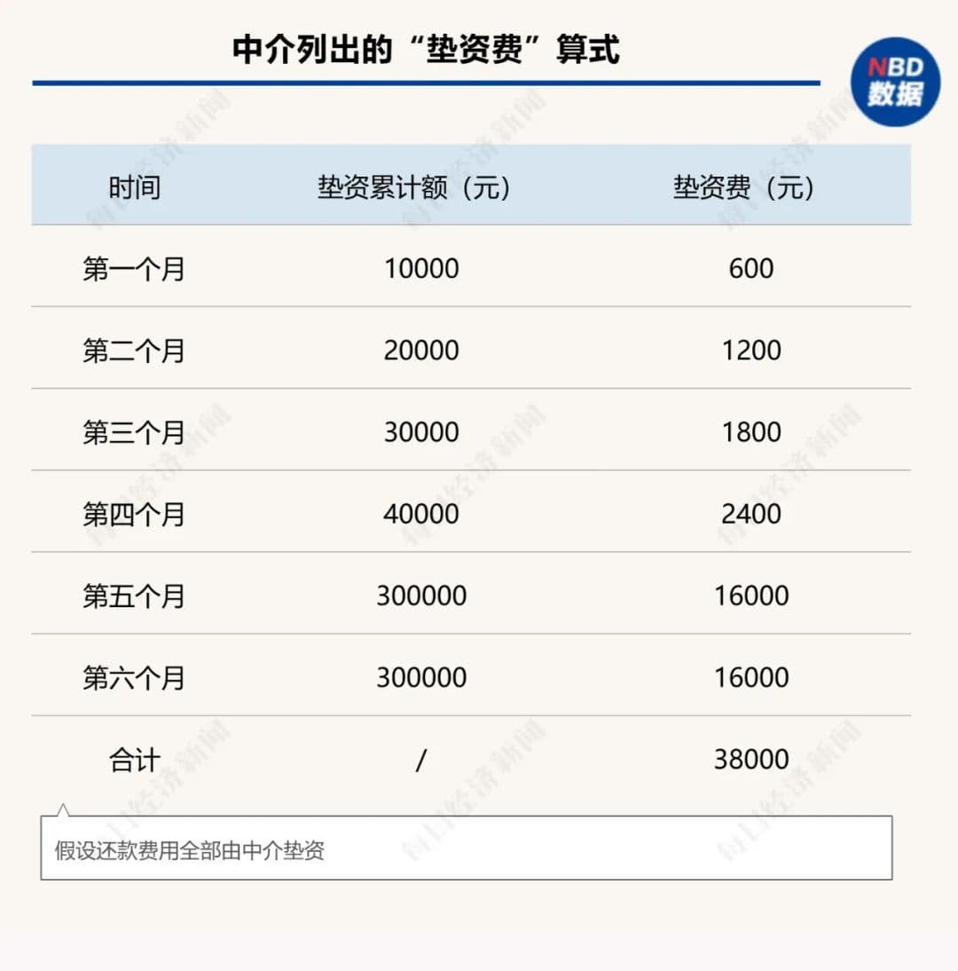 这位中介所说的“垫资费”是指该机构先提供垫资供记者还款所收取的费用,而后续融出资金则还要额外扣除10~20个点的“砍头息”。之所以垫资,是为了“养好征信”。