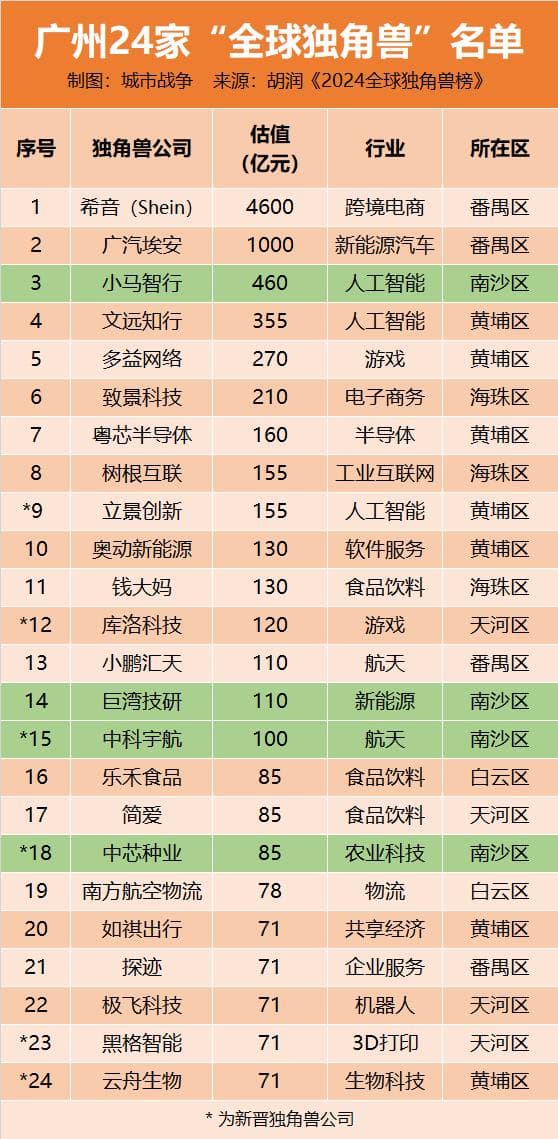 2024胡润全球独角兽榜单中,广州有24家企业上榜,位居全国第4。上榜名单中有4家为南沙企业,分别是小马智行、巨湾技研、中科宇航、中芯种业,涵盖自动驾驶、动力电池、商用火箭、半导体等多个赛道。