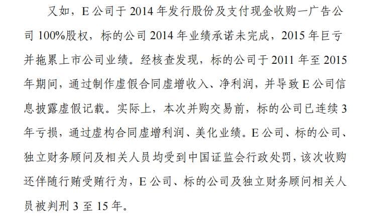 例如,D公司于2017年收购一供应链公司100%股权。经核查发现,标的公司在并购重组交易前后不同阶段,均存在虚增营业收入、利润,虚增应收款项,隐瞒关联关系及关联交易等行为。最终,标的公司及董监高、上市公司及董监高均受到中国证监会行政处罚。