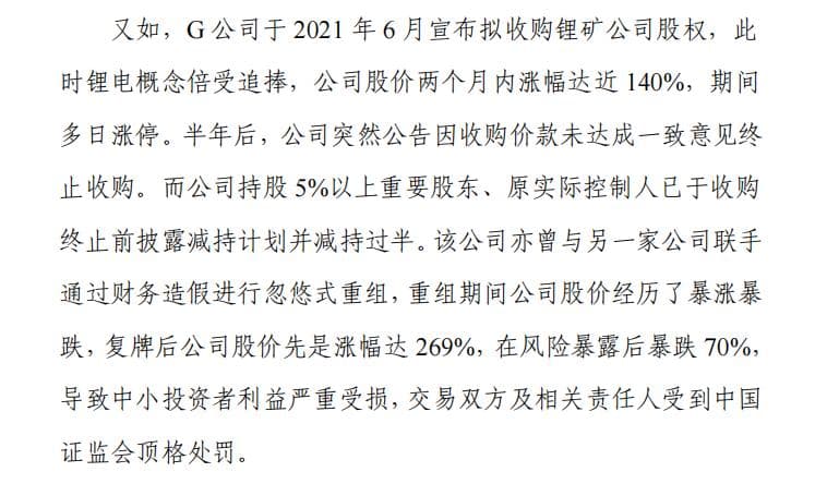 上交所表示,该公司亦曾与另一家公司联手通过财务造假进行忽悠式重组,重组期间公司股价经历了暴涨暴跌,复牌后公司股价先是涨幅达269%,在风险暴露后暴跌70%,导致中小投资者利益严重受损,交易双方及相关责任人受到中国证监会顶格处罚。