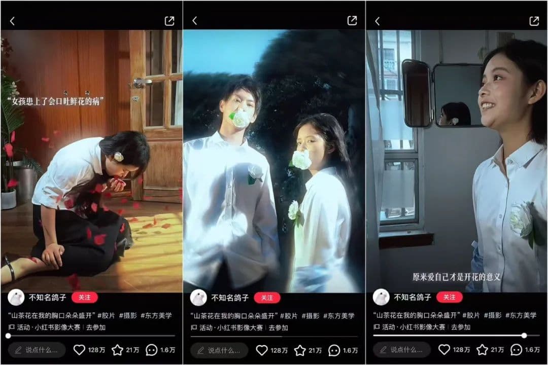 这支作品开篇充满悬疑、奇幻的色彩,成功吸引了观众的停留;中间又用多个爱情故事增加浪漫元素,配合着恰到好处的BGM将情绪层层推进;最终在视频末尾将主题升华,展现了女性应该拥有的强大精神内核,让众多用户豁然开朗。目前该笔记已经获得了128W点赞,超21W人收藏。