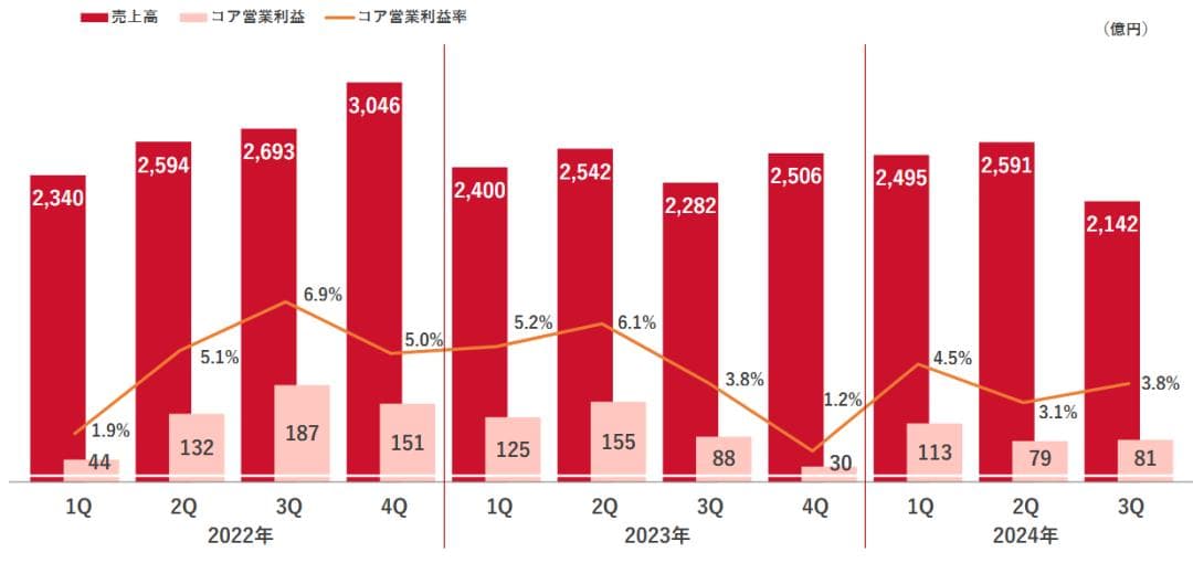 其中,2024年Q3销售额为2142亿日元(约合人民币100亿元),同比下滑6%;核心营业利润为81亿日元(约合人民币4亿元),下跌7%;营业利润下降60%。