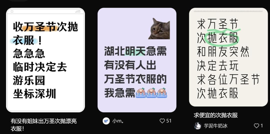 而今十月份一过,大家精心预制的万圣风美照发完几轮,小红书和咸鱼上又出现了一类新内容:出万圣节次抛衣。