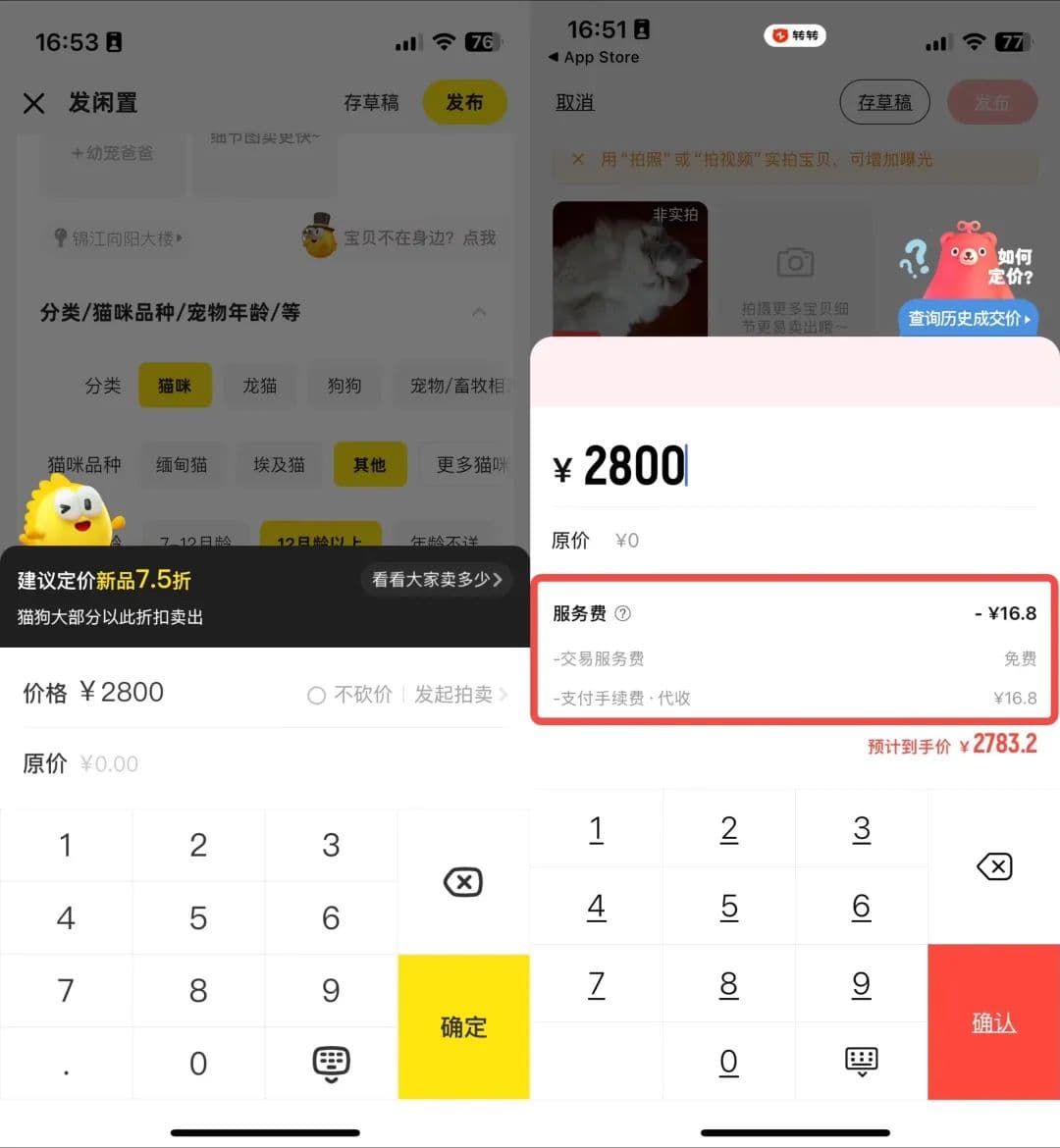 如此的扣费方式并非其他 C2C 软件惯例。像转转的手续费会在提交售价的时候直接明码标价,让用户对于到账金额有所预期。