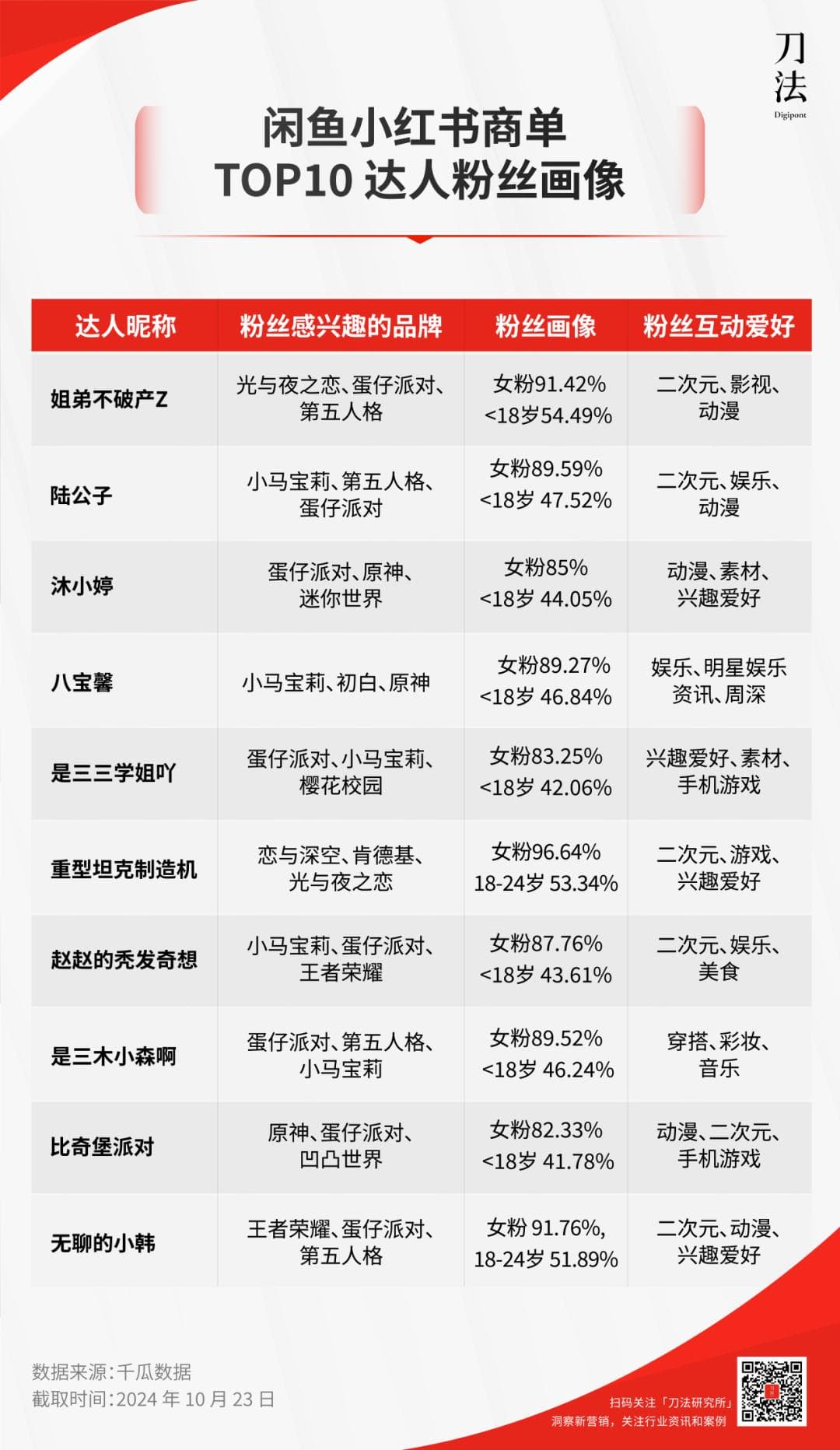 官方视频外,闲鱼在小红书上的投放也都精准直指年轻人。据千瓜数据,闲鱼在小红书投放商单 TOP10 中,所有博主粉丝占比最高的年龄段都在 24 岁以下,同时粉丝大多都对二次元、动漫、游戏感兴趣。