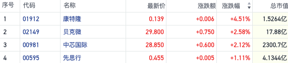 截至发稿,贝克微(02149.HK)、中芯国际(00981.HK)均涨逾2%、先思行(00595.HK)跟涨。